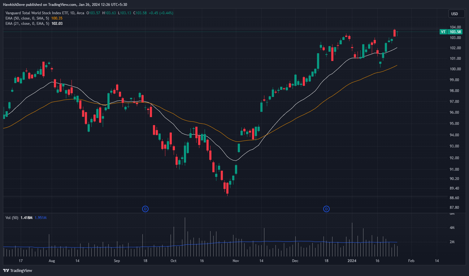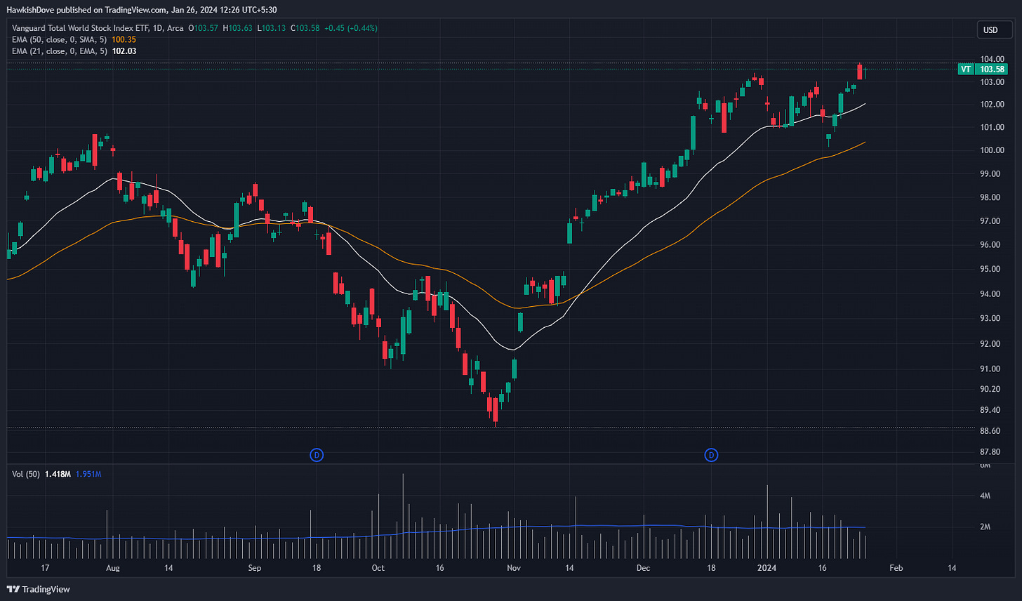 Sentiment with world markets is decent for now as we can see in the following chart of Vanguard Total World Stock Index ETF: (you can track this ETF to see if world markets are overall in an uptrend, downtrend or in a correction)