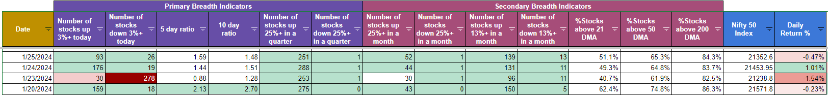 Let’s get to the meat of this week’s update and see how the Nifty Market Breadth Tables are looking now. If you remember I shared the table last week and mentioned that I’ll be sticking with the planned SIP for January 2024. Following are the links in case you missed the previous three updates :