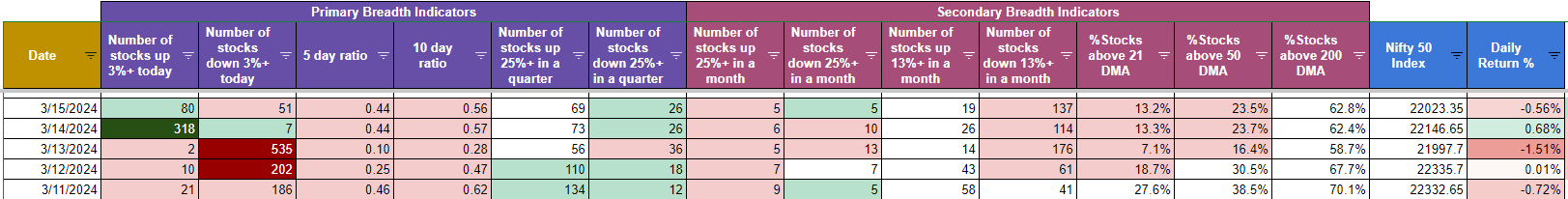 Unlike Last week, Nifty 50 took the hit this time as per the market breadth and fell more than 1.5% on 13th March as we can notice in the grid below. Also notice how one week can change the %s of stocks below a certain DMA. Is it oversold now? Should one buy ? I certainly don’t know, but what we know is how to measure the data points we have been week over week and take decision accordingly as per our risk tolerance. :)