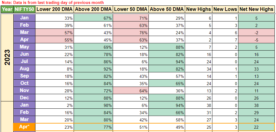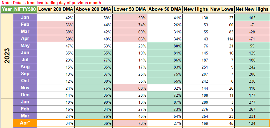 Week over week, we can see that % of stocks trading lower than 50 DMA price has increased from 51% to 73% which is quite significant and net new highs have dropped from 188 to 124. So Nifty 500 has taken a definite hit this week and one can start thinking about adding few lumpsum units right now if one is interested. Although will recommend to not be too aggressive right now.