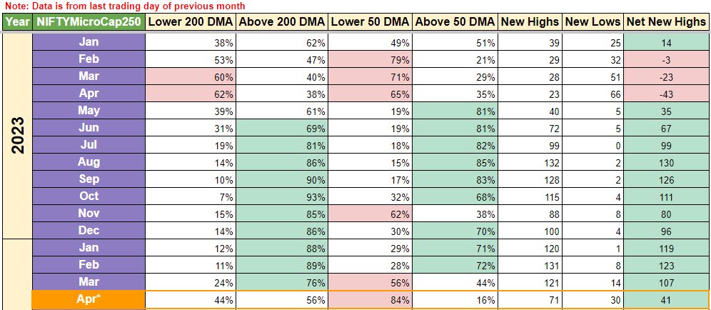 NiftyMicrocap250, well, Smallcaps were the star of the news this week, but this index took a big hit. Since not many people invest in these scrips via MFs or in the market as liquidity is low in microcaps, week over week, % of stocks below 50 DMA has gone from 65% to 84%. And I have a gut feeling that many of these stocks might shift to below 200 DMA. Already % stocks below 200 DMA have gone from 28% to 44%. So we can already see it happening. Net new highs have halved, coming down from 80 to 41.