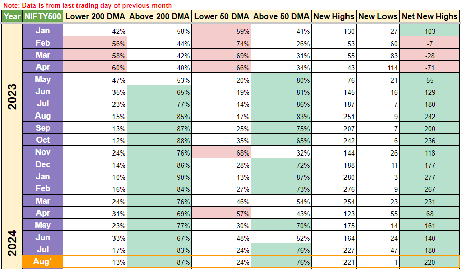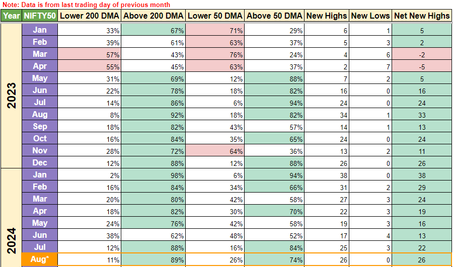 Nifty 50 market breadth stands solid again, but but but… There is a reportable change here. At the end of last week, 92% of stocks were above 50 DMA, this week its 74%. So there has been some kind of damage I would say, maybe we can even attribute this to the initial 4 days of negative or flattish movement we saw in Nifty50 Breadth Table in earlier part of the article. At the end of it, Its still in an uptrend, not enough damage to go lumpsum yet for me. Sticking with the SIP bullet for now…