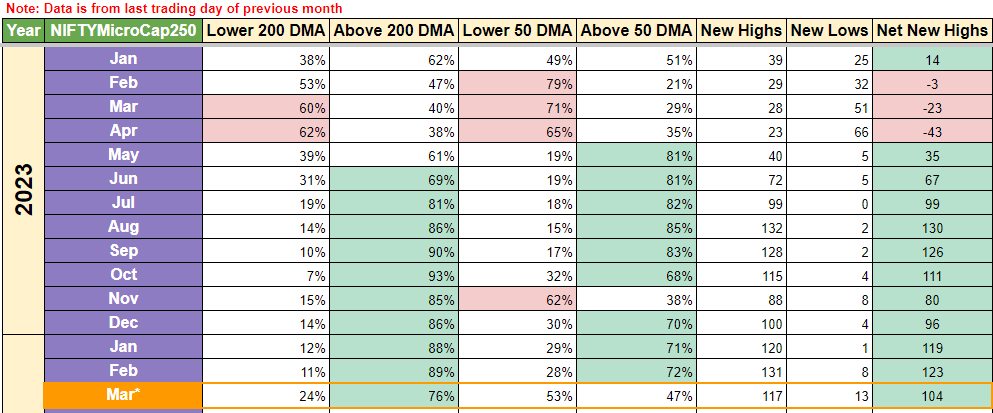 For NiftyMicroCap250, the story is similar to Nifty500, one small thing I am noticing is that %stocks below 50 DMA have increased from 46% to 53%, might not be significant enough but this tells me that the focus in the markets is shifting from microcaps or smallcaps to large caps as these indexes are sitting on poorer breadth as per the weekly numbers.