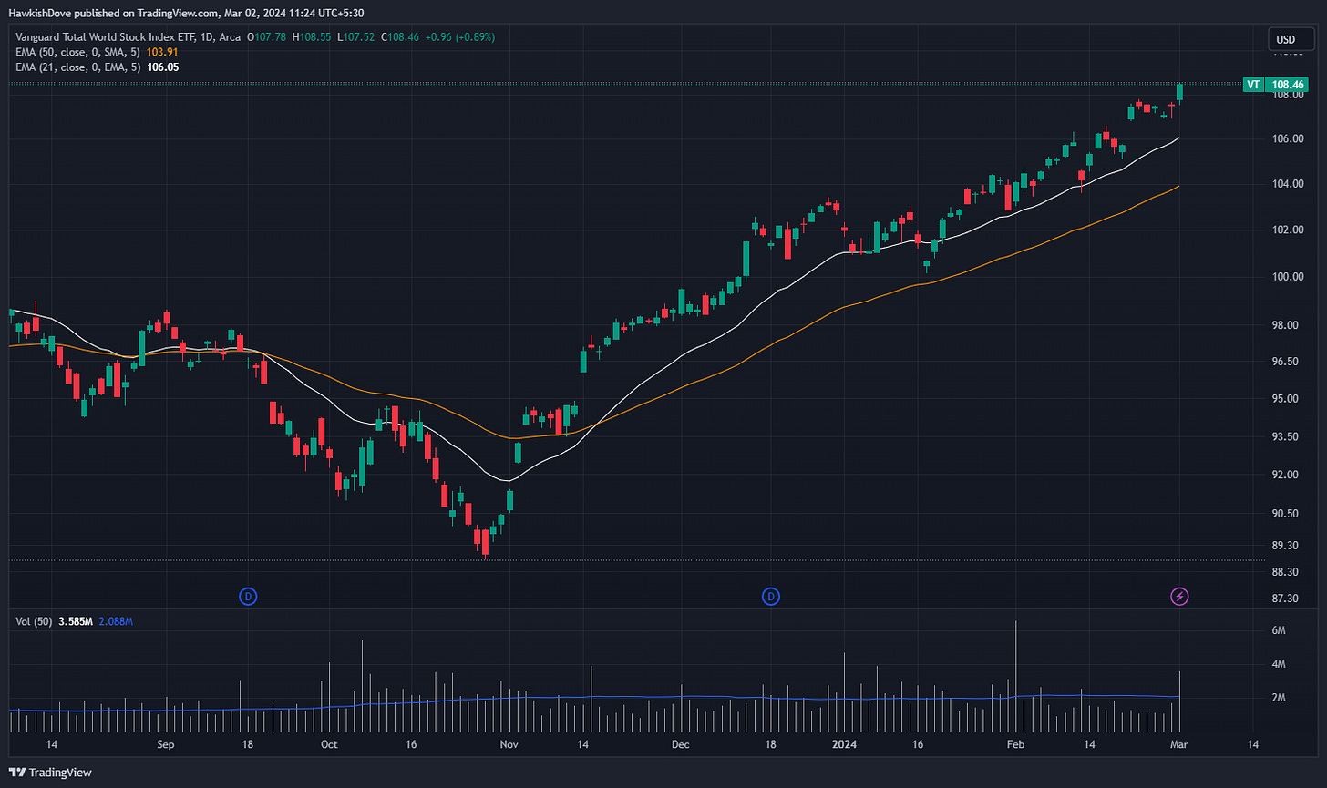 World markets have been also doing great, in fact better than Nifty50. Last many trading sessions it has not taken support at 21 DMA yet which shows good strength in uptrend and Volumes on 1st March were too good to ignore. This certainly looks like a strong momentum which has good odds to hold us as well in the next week.