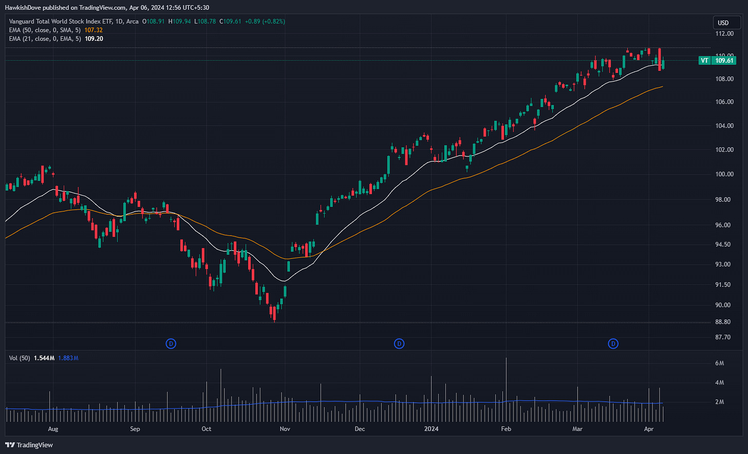 World markets on Thursday had a 1% down candle, which can be probably attributed to US Fed delaying rate cuts and whispers about Fed considering rate hikes ahead if inflation data is not the way it should be. Looks like the market was overly joyed up and was pricing the rate cuts in advance aggressively, so maybe world markets, especially US move sideways for a bit until there is clarity. As mentioned in the last newsletter about 109 level which might act as resistance, looks like technical way of thinking is working here, for now markets have taken support at 21 DMA, lets see how this goes ahead.