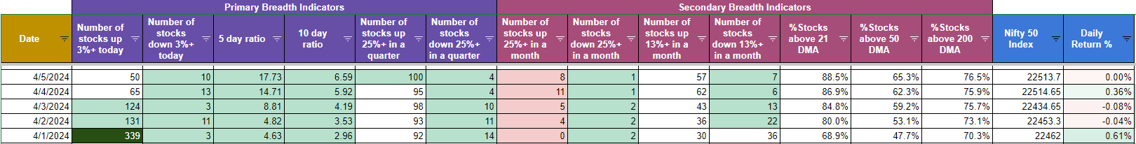 Let’s get to the meat of this week’s update and see how the Nifty Market Breadth Tables are looking now. Following are the links in case you missed the previous 3 updates :