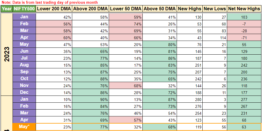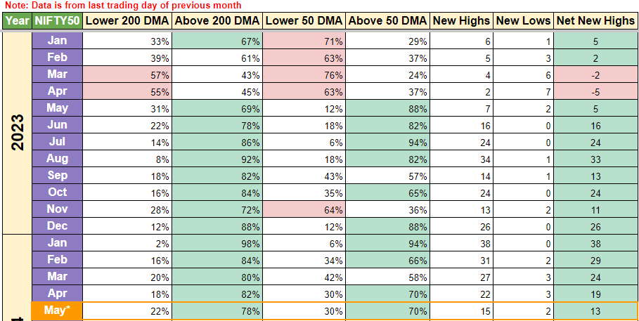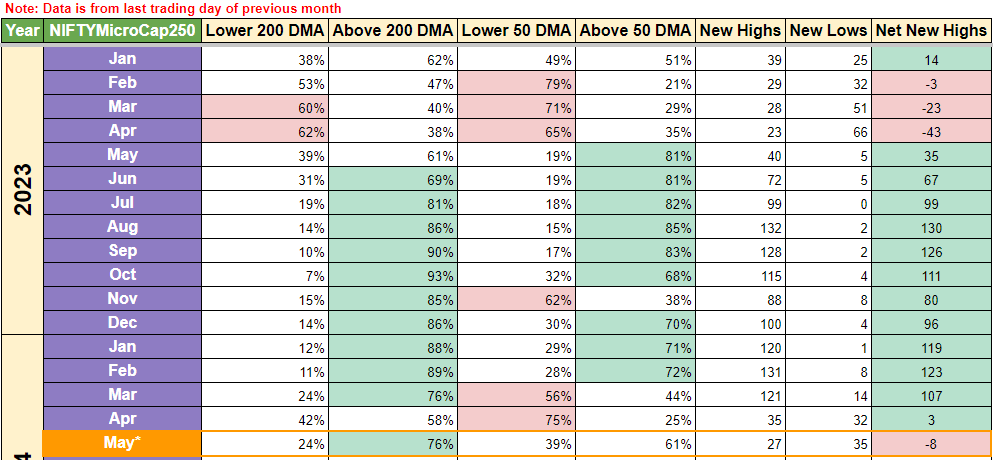 As mentioned before MicroCaps were the hardest hit and we can notice that in net new highs going below 0 this week. As mentioned above its a lagging indicator, so it should improve if the healthy trend continues. For now the good news is, MicroCaps are also out of the red cell shadow and one can resume the SIP route for this as well. If you notice, %stocks above 50 DMA have increased from 25% to 61% week over week, so this index has improved the most and if you have made lumpsum investment in the past 2 months, you would find some decent gains in your units for now.