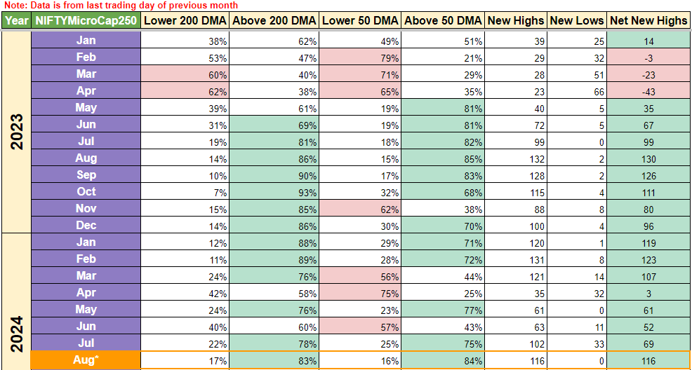 Similar story for MicroCaps as with Nifty 500. 84% stocks are now above 50 DMA vs 75% last week. Net new highs have increased from 69 to 116, indicating a lot of money coming in microcaps. Just a general thought here though, Microcaps do run faster but they have a tendency to get injured regularly (running analogy), so when the overall market moves sideways, you might see this index being hit a bit harder as it has smaller firms at the end of 750 stock universe spectrum.