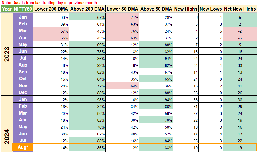 Last week Index moved a bit higher but I had a concern that market breadth didn’t improve much overall. This week all seems well. Market breadth has indeed improved. For context, 76% of stocks were above 50 DMA by the end of last week, this week its up towards 84%. So that’s a significant improvement along with Nifty50 scaling ATH again. No pessimistic viewpoint today, let’s just enjoy this momentum while it lasts :)
