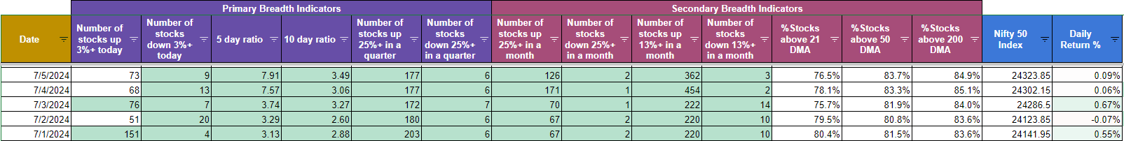 Let’s get to the meat of this week’s update and see how the Nifty Market Breadth Tables are looking now. Following are the links in case you missed the previous 3 updates :